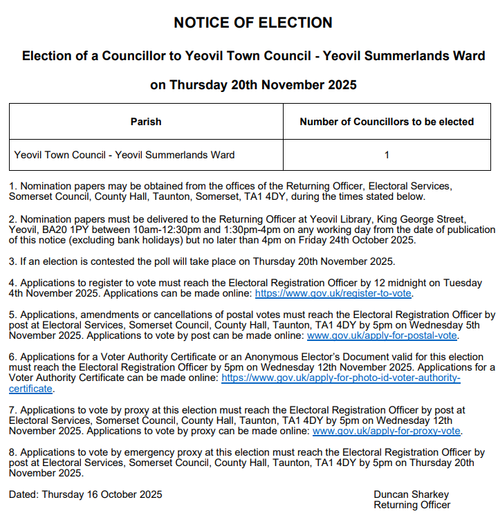 16 October 2025 NOTICE OF ELECTION - Thursday 20th November 2025 NOTICE OF ELECTION Election of a Councillor to Yeovil Town Council - Yeovil Summerlands Ward on Thursday 20th November 2025 Election document News Share Tweet